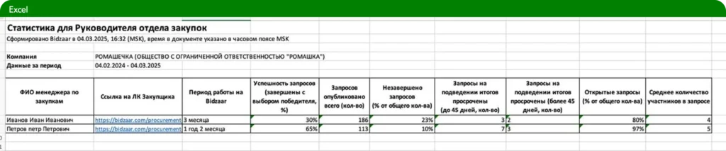 Вся аналитика на Bidzaar формируется автоматически — от базовых отчётов до тех, на которые обычно уходит несколько часов ручной работы. Особенно это заметно при подготовке сравнительных таблиц для оценки поставщиков: система сама собирает данные, выстраивает их в удобном формате и позволяет сразу увидеть различия по цене, срокам и другим параметрам. Пользователю остаётся только задать нужные настройки и проанализировать результат — вся рутина остаётся на стороне Bidzaar.