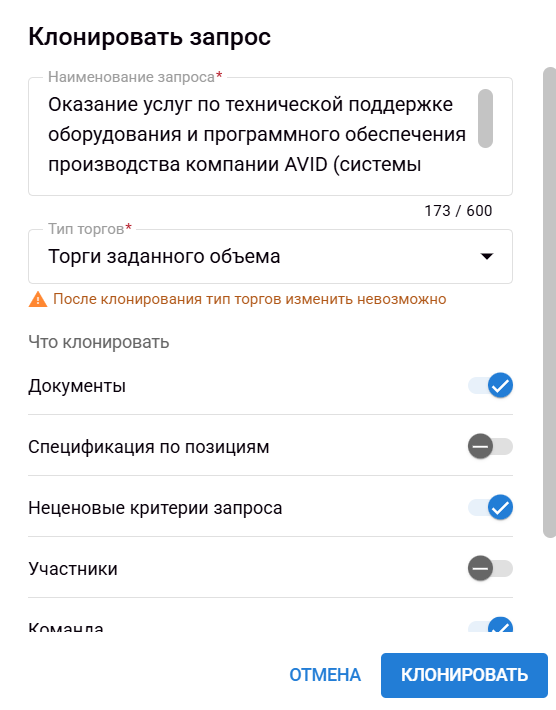 • возможность клонировать запросы – освобождает рабочее время для других задач, снижает операционную нагрузку на специалистов закупок.